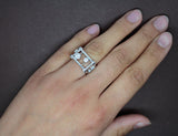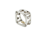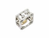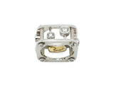 Bague Création Benoit Joaillier, modèle Etau en or blanc 750/1000e. D'inspiration mécanique, elle est sertie de six diamants en clos disposés de façon aléatoire sur fils couteaux. Des petits diamants sont sertis dans chaque boulon présent sur les deux faces de la bague.