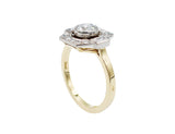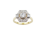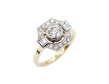 Bague solitaire Création Benoit Joaillier en or jaune 750/1000e dont la tête de bague hexagonale est en or blanc 750/1000e. Elle est ornée en son centre d'un diamant taille ancienne de 0,55 carat serti en clos, accompagné à droite et à gauche d'une baguette de diamant sertie également en clos, et en haut et en bas d'un élément pavé de diamant.