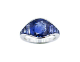 Bague Création Benoit Joaillier en or blanc 750/1000e, de type jarretière, ornée d'un saphir taille ronde couleur bleu roi, certifié Ceylan naturel non chauffé de 5,67 carats, épaulé de baguettes de saphir de la même couleur. Pierres d'occasion originellement montés sur une bague ancienne Art Déco dont nous nous sommes inspirés pour cette monture.