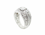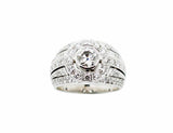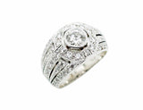 Bague Création en or blanc 750/1000e sertie de diamants inspirée de l'Art Déco. Ornée en son centre d'un diamant F-SI1 de 0,74 carat (certifié HRD) en clos, entouré de différents volumes entièrement sertis de diamants. Possibilité d'en réaliser une sur mesure, prendre contact avec nous.