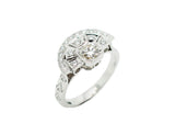 Bague création Benoit Joaillier en or blanc 750/1000e, au design d'inspiration Inca. En son centre est serti en grain un diamant taille ancienne de 0,47 carat, accompagné d'un pavage de diamants pour un poids total d'environ 0,15 carat. Travail d'ajourage et de millegrain. Corps gravé de motifs d'inspiration inca.