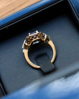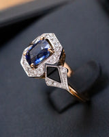 Bague Création Benoît Joaillier en or rose, réhaussé d'or blanc 750 millièmes, dont le centre est serti d'un Saphir taille coussin, certifié CGL, sertie sur quatre griffes en or rose 750 millièmes. L'entourage de 14 Diamants taille brillant, est rehaussé de millegrain et encadré par deux escaliers en forme de losange, sertis par deux triangle d'onyx, pour la première, et pavés de Diamants, pour la seconde. Le corps de bague en deux fils souligne le panier ajouré d'écailles.