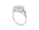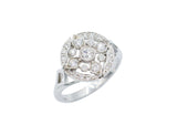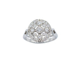 Bague Création Benoit en or blanc 750/1000e, travaillée entièrement de repercés à la manière des bijoux Art Déco des années 1920. En son centre, un diamant central de 0,15 carat est serti dans un clos millegrainé, entouré de quatre diamants sertis dans des losanges aux quatre points cardinaux, entre lesquels de petits diamants sont sertis dans de petits clos millegrainés. Entourage diamants. Travail de millegrain.