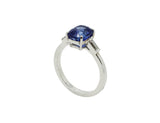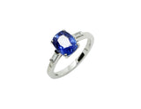 Bague en or gris 18 carats sertie d'un Saphir de Ceylan Naturel de 3,11 carats, épaulé de 2 diamants "baguette" poids total : 0.5 carat. Le Saphir est accompagné d'un certificat du laboratoire de gemmologie T.G.L. attestant que la pierre n'a subi aucune modification thermique.