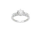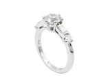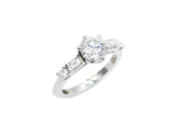 Bague en or blanc 750/1000e, ornée en son centre d'un diamant taille moderne certifié HRD I-VS2 1,11 carat, serti sur 6 griffes. De chaque côté, un diamant baguette suivi d'un diamant brillant. Corps de bague biseauté.