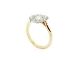 Bague Création Benoit Joaillier en or 750/1000e, ornée d'un diamant central de 0,45 carat, serti sur un plateau rond en or blanc 750/1000e et bas sur le doigt, serti de diamants en grains type "trompe l'oeil". Anneau simple et fin en or jaune 750/1000e.
