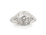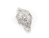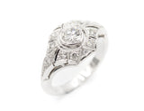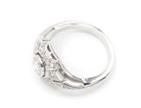 Bague Création en or blanc 750/1000e sertie en son centre d'un diamant taille brillant G-SI de 0,46 ct en clos, entouré de différents volumes entièrement pavés de diamants avec détails de millegrain.
