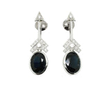 Boucles d'oreilles en or blanc 750/1000e en forme de flèches pavées de diamants sertis en grains. Chacune a un saphir bleu nuit ovale de Madagascar de 3,50 carat environ serti en clos et mobile.