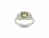 Bague Création Benoit Joaillier, d'inspiration Art Déco, avec en son centre un diamant jaune rond de 0,60 carat sur une structure carrée accompagnée de chaque côté de deux "marches d'escalier" pavées de diamants blanc.