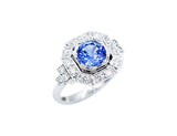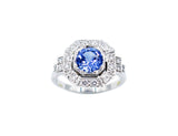 Bague Création Benoit Joaillier en or blanc 750/1000e, sertie en son centre d'un saphir bleu clair rond de 1,19 carat, serti double grains dans un carré pans coupés. Entourage diamants d'inspiration Art Déco. Corps de bague simple et demi rond.