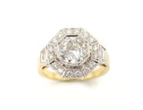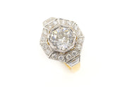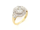 Bague Création Benoit Joaillier en or jaune 750 millièmes, ornée en son centre d'un diamant taille ancienne de 1,01 ct certifié HRD H-Si2, entouré de seize diamants taille brillant et épaulé de deux diamants trapèzes sertis sur or blanc 750 millièmes.