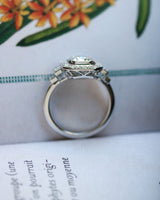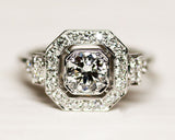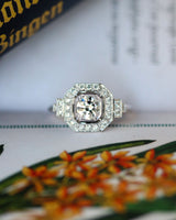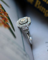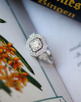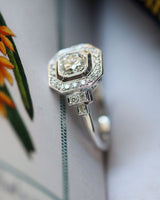 Bague Création Benoît Joaillier en or blanc 750 millièmes dont le centre est serti d'un diamant taille ancienne 0,57 ct serti double grains dans un carré pans coupés. Entourage de 22 Diamants taille brillant d'inspiration Art Déco. Corps de bague simple en demi rond.