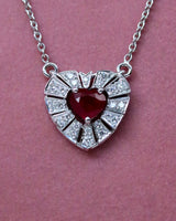 Pendentif en or blanc 750 millièmes représentant un Cœur, entièrement pavée de diamants taille brillant, dont le centre est orné d'un Rubis cœur par trois griffes. Chaine fixe en or blanc 750 millièmes en maille forçat ronde.