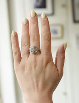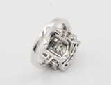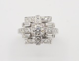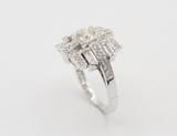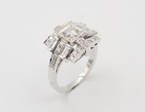 Bague Création Benoît Joaillier en or blanc 750 millièmes dont le plateau est constitué de plusieurs bandes rectangles, qui, assemblées, forment un carré. Au centre est serti d'un Diamant taille brillant certifié IGI, dont part quatre lignes pavées de Diamants taille brillant et de grains. Entre ces lignes, sont sertis, en mi-clos, quatre Diamants baguettes. Corps de bague simple section carrée.