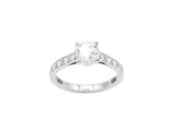 Bague solitaire en or blanc 750/1000e, ornée en son centre d'un diamant taille moderne certifié HRD G-VS2 1,02 carat, serti sur 4 griffes. De chaque côté, le corps est pavé d'une bande diamants sertis en grains.