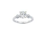 Bague Solitaire Création Benoit en or blanc 750/1000e, ornée en son centre d'un diamant taille coussin de 1,29 carat certifié J-SI1 (CGL), épaulé de chaque côté d'un motif de palmette Art Déco sertie de deux diamants. Corps de bague simple.