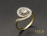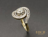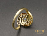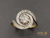 Bague tourbillon en or jaune 750 millièmes dont le centre est serti d'un diamant taille ancienne sur huit griffes de platine. De chaque côté, le corps de bague fin, revient en tourbillon autour du chaton central, pavé de diamants taille rose sur réhaut de platine. Très belles mises à jour en écailles.
