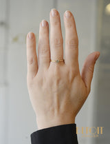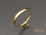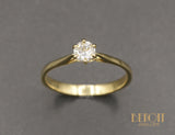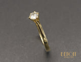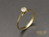 Solitaire en or jaune 750/e orné en son centre d'un Diamant taille brillant d'environ 0,30 carat, serti dans un chaton six griffes, posé sur un corps de bague demi-jonc, pincé arrivé à la tête de bague.
