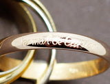 Bague alliance signée Cartier de la collection "Les Must de Cartier" et "Trinity" 5 anneaux 3 ors 750/1000e, dont un rose, deux jaunes et deux blancs. Sur l'anneau d'or rose, la signature "Les Must de Cartier" est gravée à l'extérieur, et à l'intérieur "750 50 08632G".