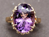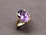 Bague en or jaune 750/1000e en or jaune ornée d'une belle améthyste ovale sertie par quatre griffes. Le panier est travaillé de fils torsadés et de petites boules. Corps de bague simple et plat.
