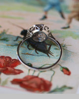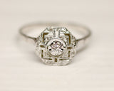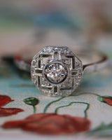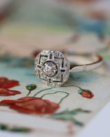 Bague Art Déco en or blanc 750 millièmes et platine, de forme octogonale, sublimée en son centre par un diamant taille moderne, serti par six griffes sur un chaton délicatement gaufré. Le plateau ajouré, pavé de diamants taille rose sertis clos perlés et grains, apporte éclat et raffinement à l’ensemble. Son panier, travaillé avec légèreté, lui confère une allure aérienne, tandis que son corps de bague fin accentue son élégance. Un bijou en très bon état.