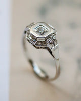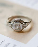 Bague Art Déco en Or Blanc 750 millièmes et Platine, sertie d'un diamant taille brillant en clos et grains, au centre d'un entourage carré pans coupés, épaulé par des doubles godrons ciselé en trompe l'œil et souligné par une bande sertie de diamants taille rose.