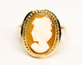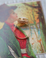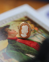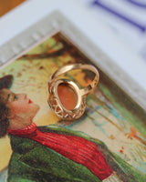 Bague en or rose 750 millièmes ornée d'un camée en cornaline finement gravé, représentant le portrait d'une jeune fille aux cheveux relevés. Le camée est serti clos et rehaussé d'une bordure ornée d'une élégante torsade. Le panier ajouré et finement travaillé est soutenu par deux délicates palmettes, tandis que le corps de bague reste sobre et épuré. Une superbe pièce du XIXe siècle en très bon état.