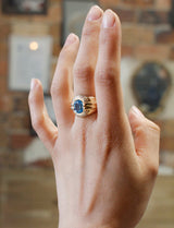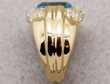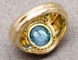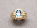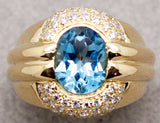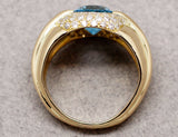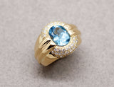 Bague type dôme en or jaune 750/1000e, anciennement sertie d'un corail que nous avons remplacé par une topaze bleue taille ovale de 2,92 carats sertie en clos, entourée d'un pavage en grains de diamants séparé en deux par deux godrons de part et d'autre. Beau travail de mises à jours sous les diamants.