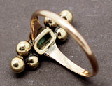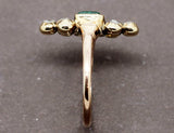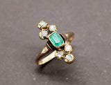 Bague ancienne en or rose 750/1000e, ornée en son centre d'une émeraude taille émeraude sertie en clos millegrainé et surmontée en haut et en bas de trois diamants disposés en triangle de chaque côté, sertis en clos et grains. Le tout est serti sur des cuvettes avec cliquant, typique des bijoux pré-XXe siècle.