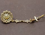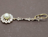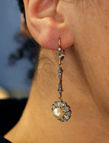 Boucles d'oreilles pendantes en or jaune 585/1000e (14K) avec réhauts d'or blanc 585/1000e. En bas se trouve un motif floral composé d'une perle de culture de 7 millimètres de diamètre entourée de diamants taille ancienne sertis en grain. Ensuite, un élément stylisé serti de diamant taille rose relie la partie du bas avec la partie attachée au système pour oreille percée. Travail fin et motif délicat.