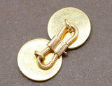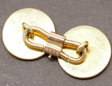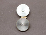 Paire de boutons de manchettes Art Déco, composés chacun de 2 disques en or jaune 750/1000e réhaussés de platine et ornés en leurs centres de petits diamants en serti clos avec millegrain. La surface de chaque disque est striée de cercles concentriques reflétant la lumière. Les disques sont maintenus par deux par un système d'accroche amovible en or jaune 750/1000e.