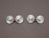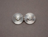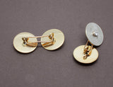 Paire de boutons de manchette Art Déco, composés chacun de deux disques en or jaune 750 millièmes réhaussé de platine, ornés en leurs centres de petits diamants en sertis clos avec millegrain. La surface de chaque disque est striée de cercles concentriques reflétant la lumière. Les disques sont maintenus par deux par un système d'accroche amovible en or jaune 750 millièmes.