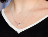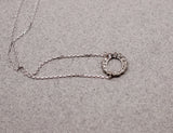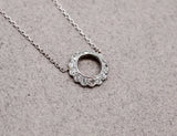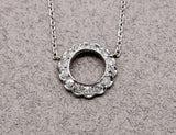 Ancien entourage de bague des années 1910 en platine remonté en pendentif sur une chaîne d'or blanc 750/1000e neuve. Sa forme, florale, est ornée de 14 diamants taille ancienne sertis en grains. Joli travail de mise à jour permettant aux diamants de révéler tout leur éclat.