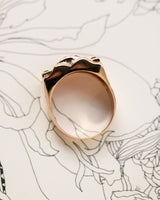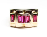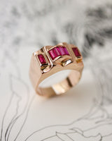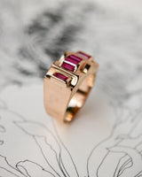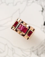 Bague en or rose 750 millièmes de style Tank, composé de différents volumes représentant un livre ouvert au centre pavé de quatre Rubis verneuil taille emeraude réhaussé de deux rubis verneuil taille emeraude. Bijou évidé pour plus de légèreté. Bijou en trés bon état.