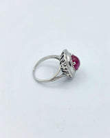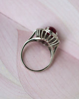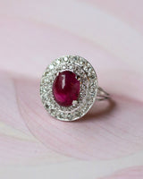 Bague Cocktail en Or Blanc 750 millièmes et platine, ornée d'un rubis cabochon ovale en serti griffes et épaulé d'un double entourage de diamants taille 8/8 serti en grain et millegrain. Panier et corps en fils. Bague en bon état.