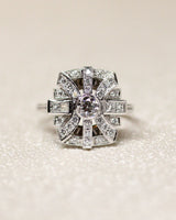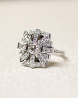 Bague Création Benoit en or blanc 750 millièmes, ornée en son centre d'un diamant taille ancienne de 0,30 carat serti clos au milieu d'un plateau ajouré et inspiré de l'Art Déco, pavé de diamants taille brillant. De part et d'autre du diamant central sont sertis en clos de forme rectangle deux diamants taille princesse. Corps de bague, double fil.