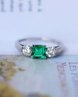 Bague trilogie en platine 950/e, composée d'une Emeraude taille princesse (légèrement égrisée) épaulé de deux Diamants taille brillant (estimés ~ G-VS) sur sertis griffes. Corps de bague fin en fuite. Bague en très bon état.