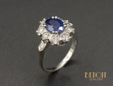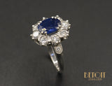 Bague en or blanc 750 millièmes datant des années 1970, ornée en son centre d'un saphir bleu roi ovale serti par quatre doubles griffes, accompagné d'un entourage de huit diamants sertis en demi-clos et griffes. De chaque côté de la tête de bague est épaulée de deux petits diamants sertis sur une forme de flèche.