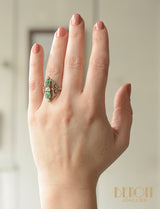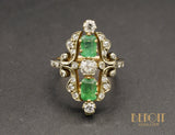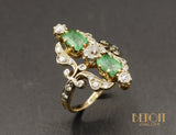 Bague Marquise en or jaune 750 millièmes, dont la ligne centrale est sertie alternativement de trois diamants et deux émeraudes . De chaque côté, des motifs en forme d'arabesques en or blanc 750 millièmes sont pavés de diamants, soulignés de millegrain. Corps de bague fin.