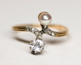 Bague toi et moi datant des années 1910 en or jaune 750 millièmes réhaussée de platine. Formant deux volutes avec respectivement en leur centre un diamant taille ancienne (inclusion pleine table) et une perle fine. Les volutes sont pavées de petits diamants taille rose. L'anneau est gravé en 2 lignes. Bijou en bon état.