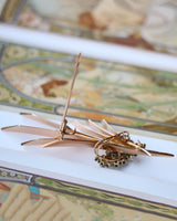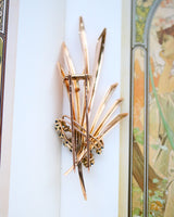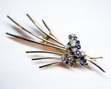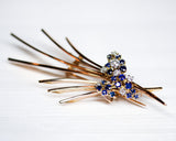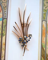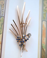 Broche en or rose 750/1000e représentant un motif à longues feuilles, entouré à la base par deux fils fins pavés de Saphirs ronds sertis griffes et de Diamants taille ancienne sertis griffes en or blanc 750/1000e. Système broche double épingle. Très bel ouvrage, élégant en très bon état.