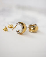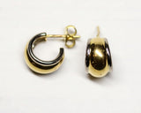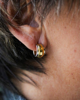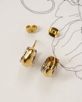 Paire de créoles en or jaune et blanc 750 millièmes, en bandeau large en fuite bordé de chaque côté d'un fil ourlé en or blanc. Système pour oreilles percées fermoir papillon. Beau bijou en bon état.
