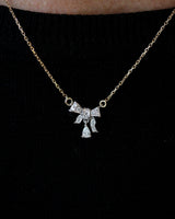 Pendentif en or blanc 750 millièmes Création benoit joaillier de style Art Déco en or blanc 750 millièmes composées de motifs géométriques représentant un noeud, entièrement pavé de diamants taille brillant sertis clos, millegrain et grains. Un Diamant taille poire serti griffes est monté en pampille articulée sur le bas du noeud. Le pendentif est fixé sur une chaine en or jaune 750 millièmes en maille forçat diamantée et peut être réglé à deux hauteurs.
