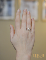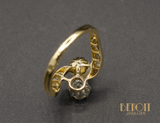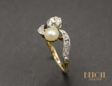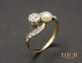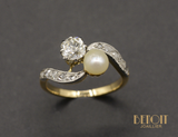 Bague "Toi et Moi" ancienne en or jaune 750 millièmes, mettant côte à côte une perle bouton et un diamant taille ancienne serti sur chaton couronné huit griffes de platine. De part et d'autre, l'anneau de la bague prend la forme de volutes, serties de diamants taille rose sur rehaut de platine..