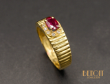 Bague Ruban en or 750/e, sertie, au centre, d'un Rubis ovale sur quatre griffes, entouré d'un ovale surélevé pavé de Diamants taille brillant. Corps de bague légèrement en fuite avec un motif canelé sur la partie supérieure.