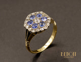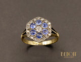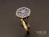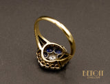 Bague en or jaune 750 millièmes dont le plateau entièrement réhaussé d'argent est orné d'un diamant taille ancienne en son centre, entouré de saphirs taille ancienne d'un bleu limpide, entouré une seconde fois de diamants taille rose. Panier finement ouvragé de dentelle et palmettes composées de trois brins dont le central est fait de pointillés et liées au corps de bague biseauté par trois stries. Bijou délicat.