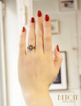 - Pierres : Saphirs ~0,80 ct, Diamant central ~0,10 ct, entourage Diamants ~0,15 ct