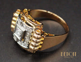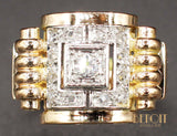 Bague en or jaune 750/1000e de style post Art Déco moderniste, ornée d'un diamant taille ancienne serti sur un carré de platine, au centre d'un second carré de platine serti de petits diamants taille rose épaulé de godrons d'or jaune. Anneau plat, en fuite. Bijou de très belle facture.