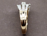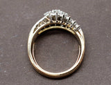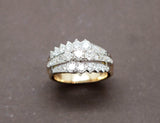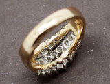 Bague ancienne en or jaune 750/1000e datant des années 1940. Le haut de la bague se divise en 3 anneaux réhaussés de platine, sertis de diamants ronds de différentes tailles : au centre, tailles brillants modernes, suivis de tailles anciennes, puis de taille roses de part et d'autre. Un anneau ressort est placé dans la bague, modifiable sur demande.