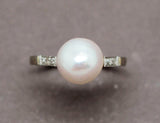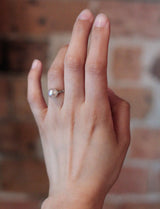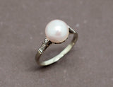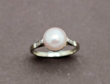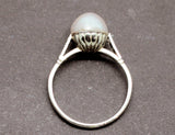 Bague ancienne de forme marquise en or blanc 585/1000e, ornée en son centre d'une perle Mabé baroque légèrement rosée, fixée sur une calotte godronnée et épaulée de petits diamants taille rose sur les extrémités du corps de bague.